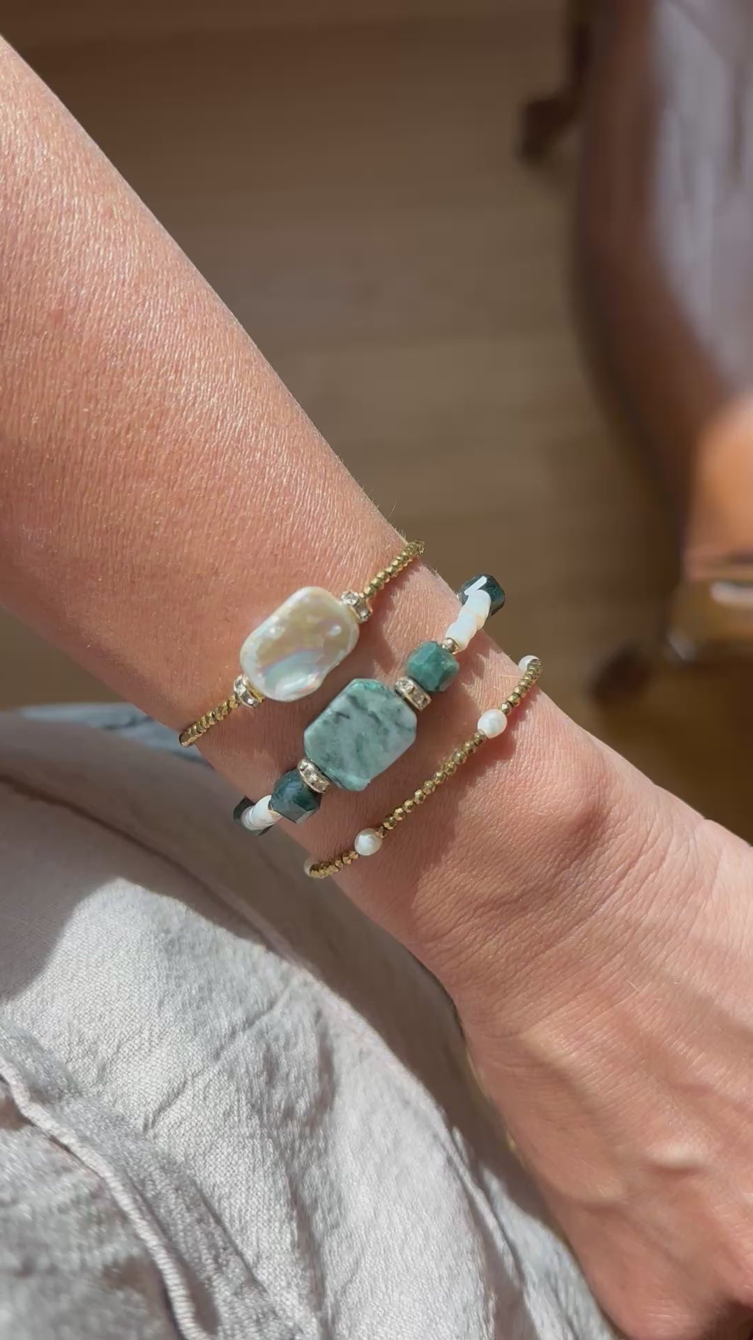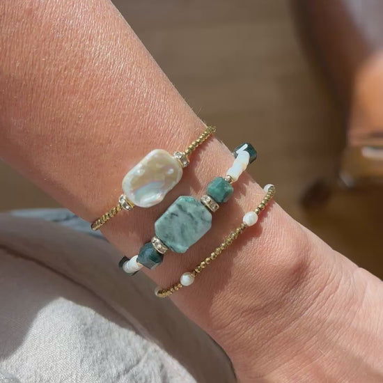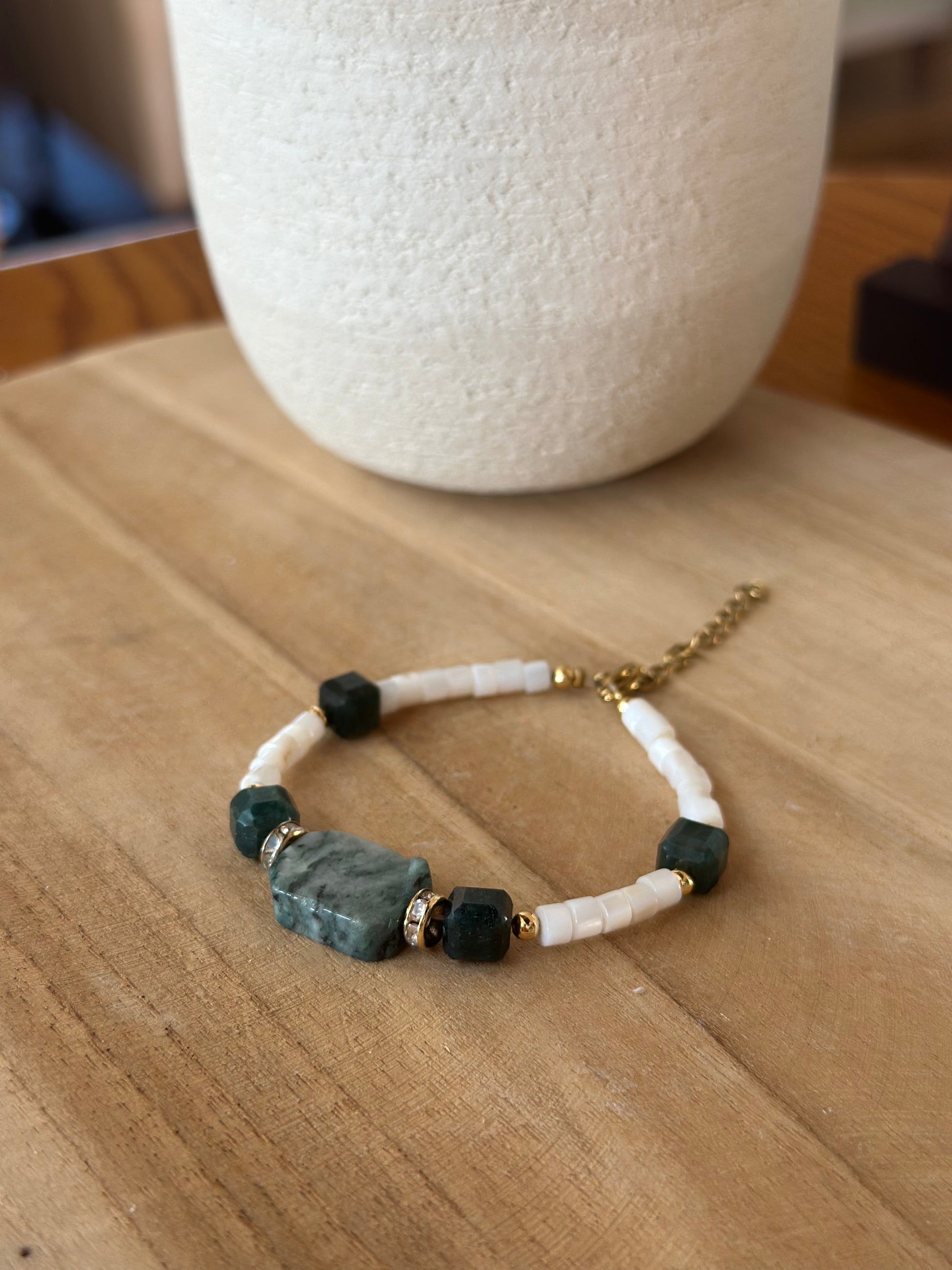 Bracelet en coquille d'eau douce, Turquoise Africaine, Agate Mousse et pierre centrale en Dioptase entourée de zircon en acier inoxydable