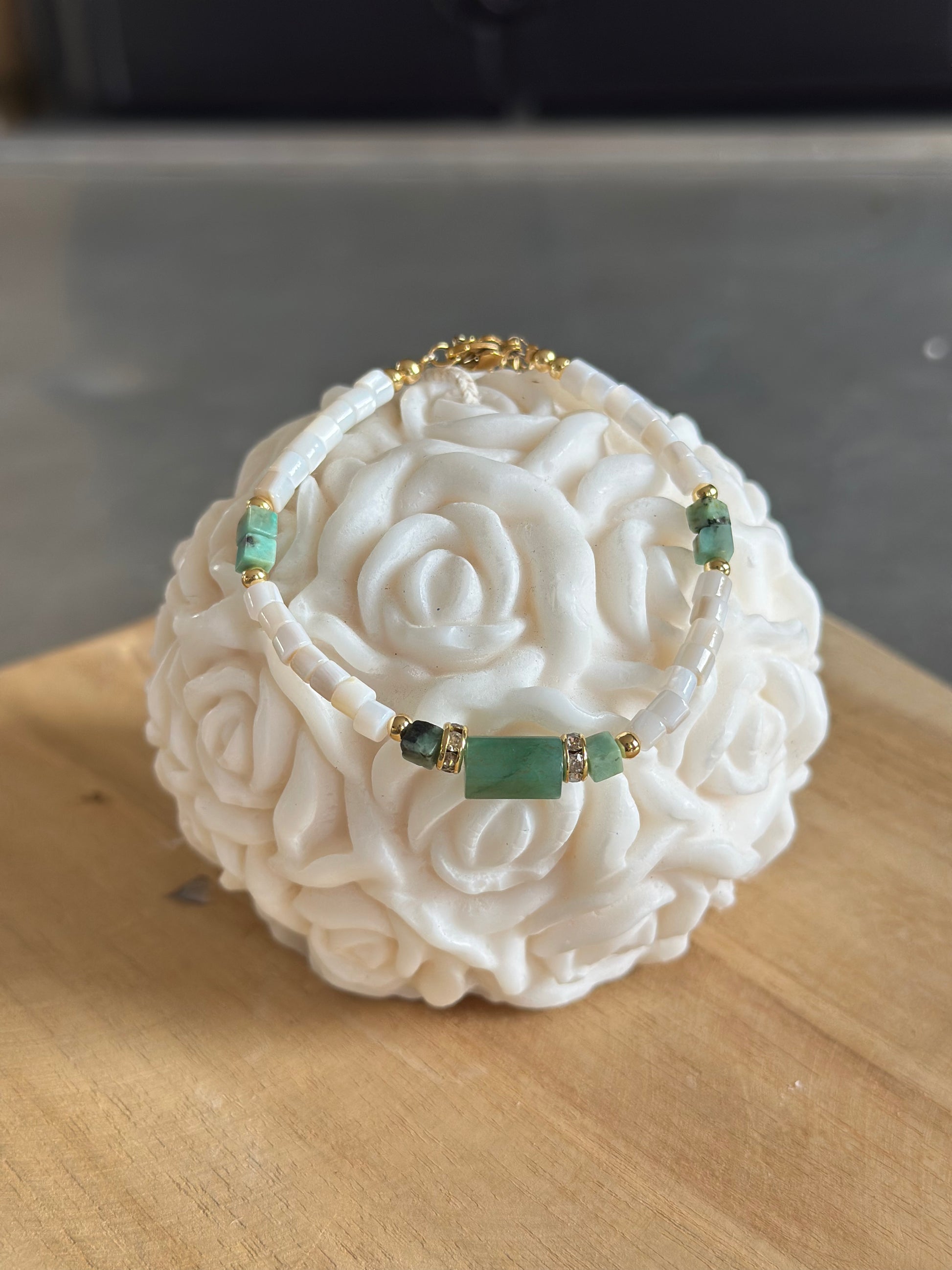 Bracelet en perles naturelles, coquille d'eau douce, Turquoise Africaine et pierre centrale en Émeraude entourée de perles Zircon en acier inoxydable