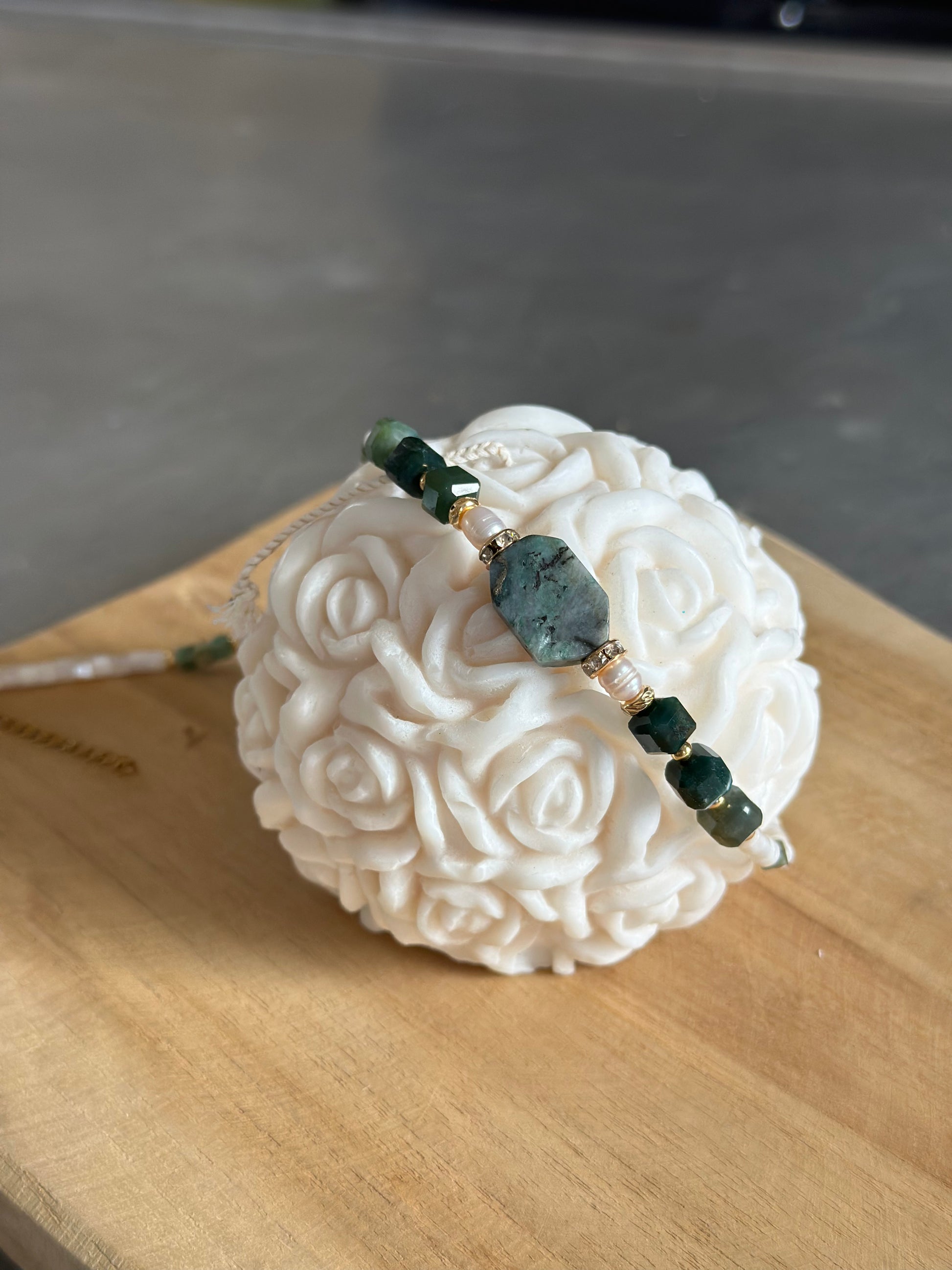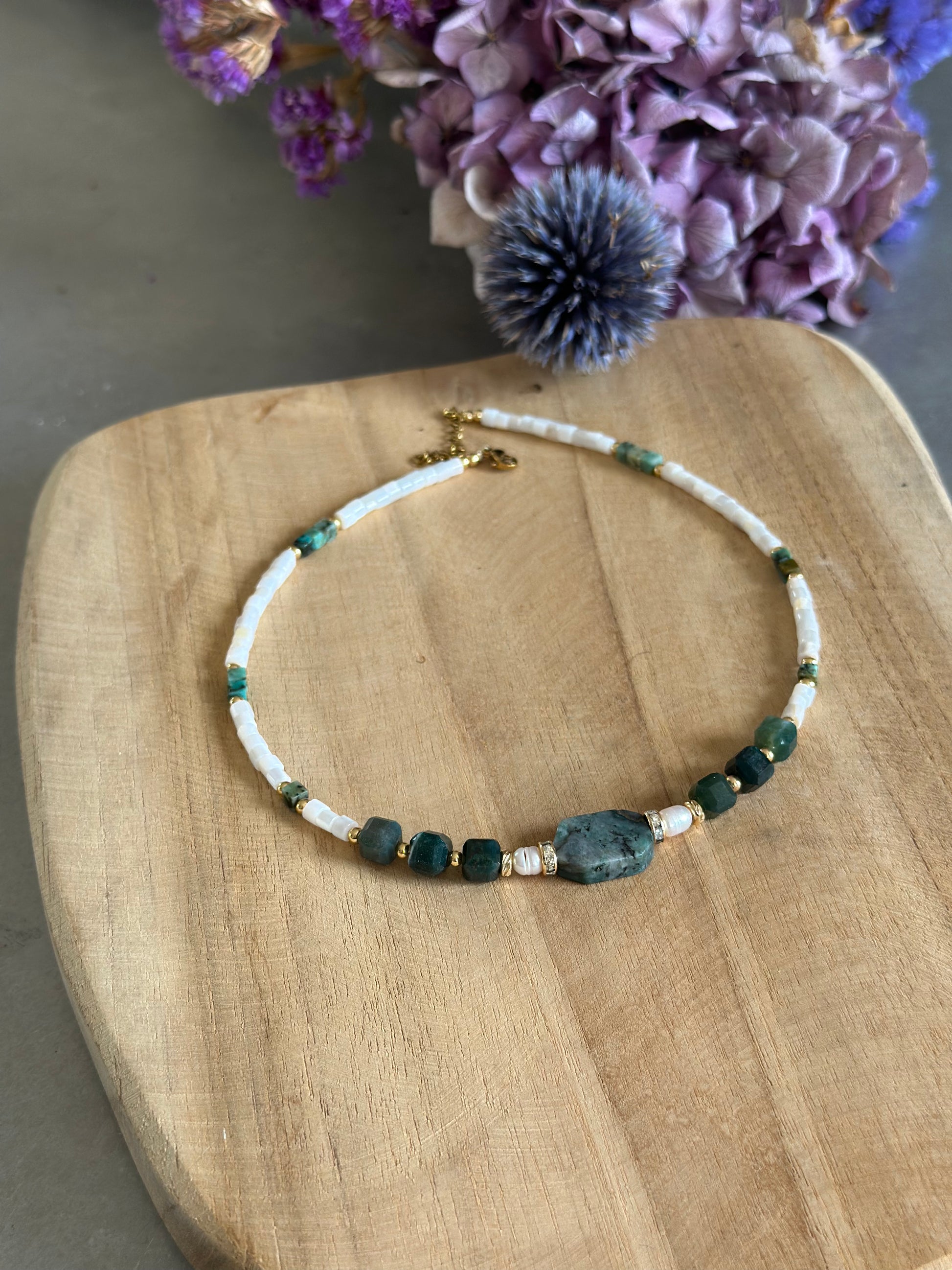 Collier mi long en coquille d'eau douce, Turquoise Africaine, Agate Mousse & Nacre, pierre centrale : Dioptase entourée de zircon en acier inoxydable