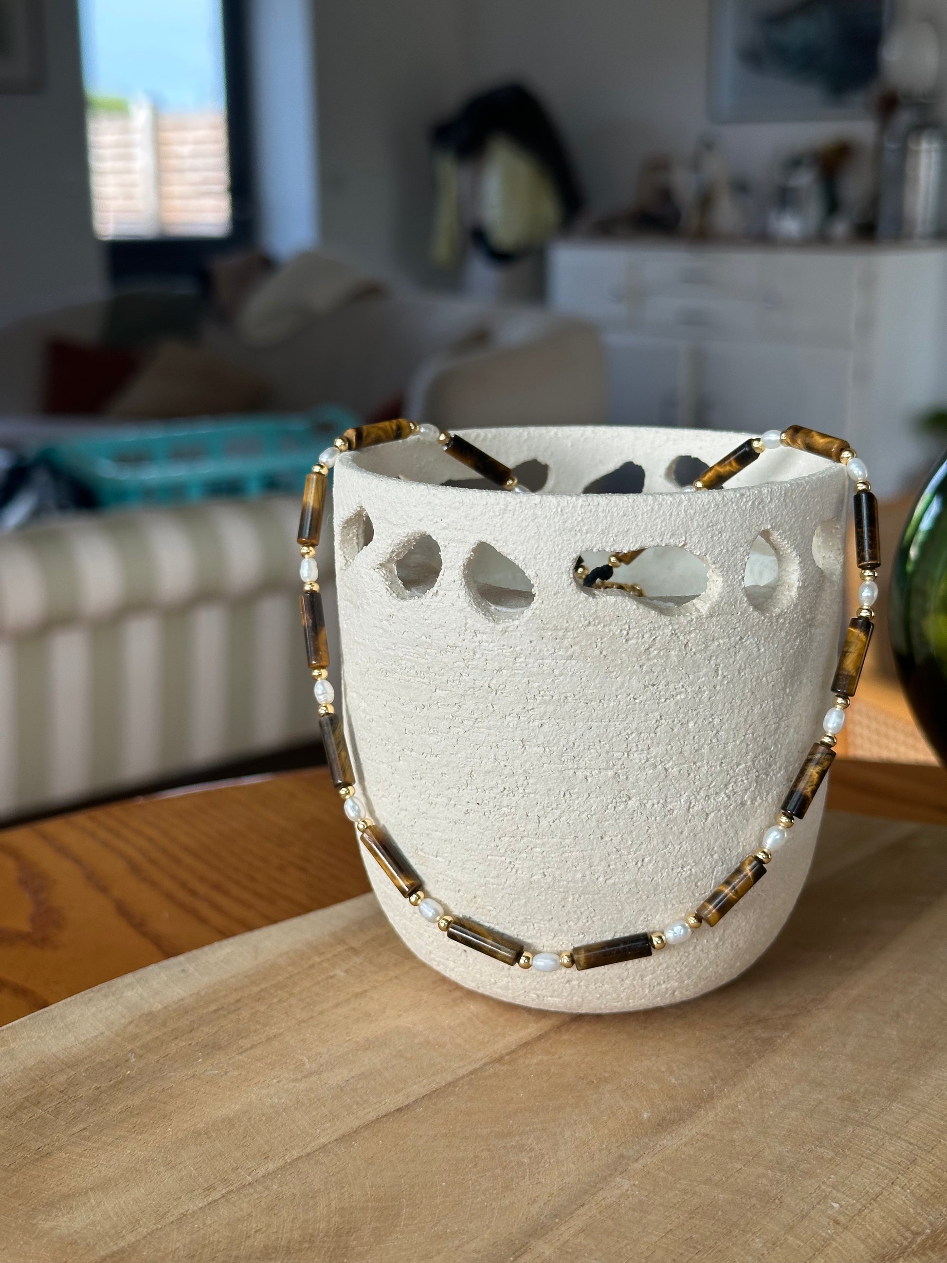 Collier ras-de-cou en perles tube œil de tigre naturel et perles de culture