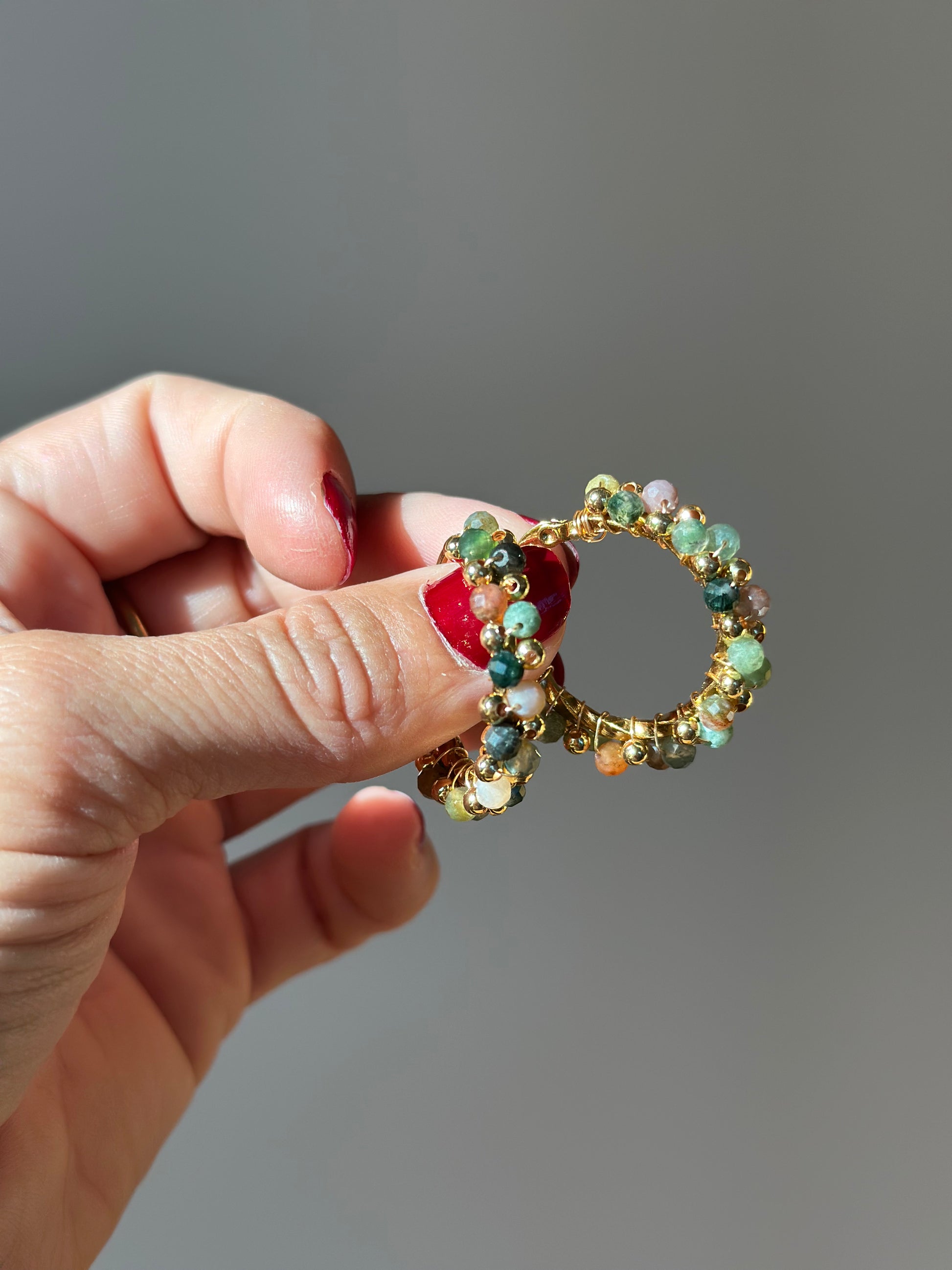 Créoles en acier inoxydable hypoallergenique torsadées, tissées à la main, Agates indiennes naturelles accompagnées de perles dorées à l'or fin 24K, fil en goldfilled (or laminé)