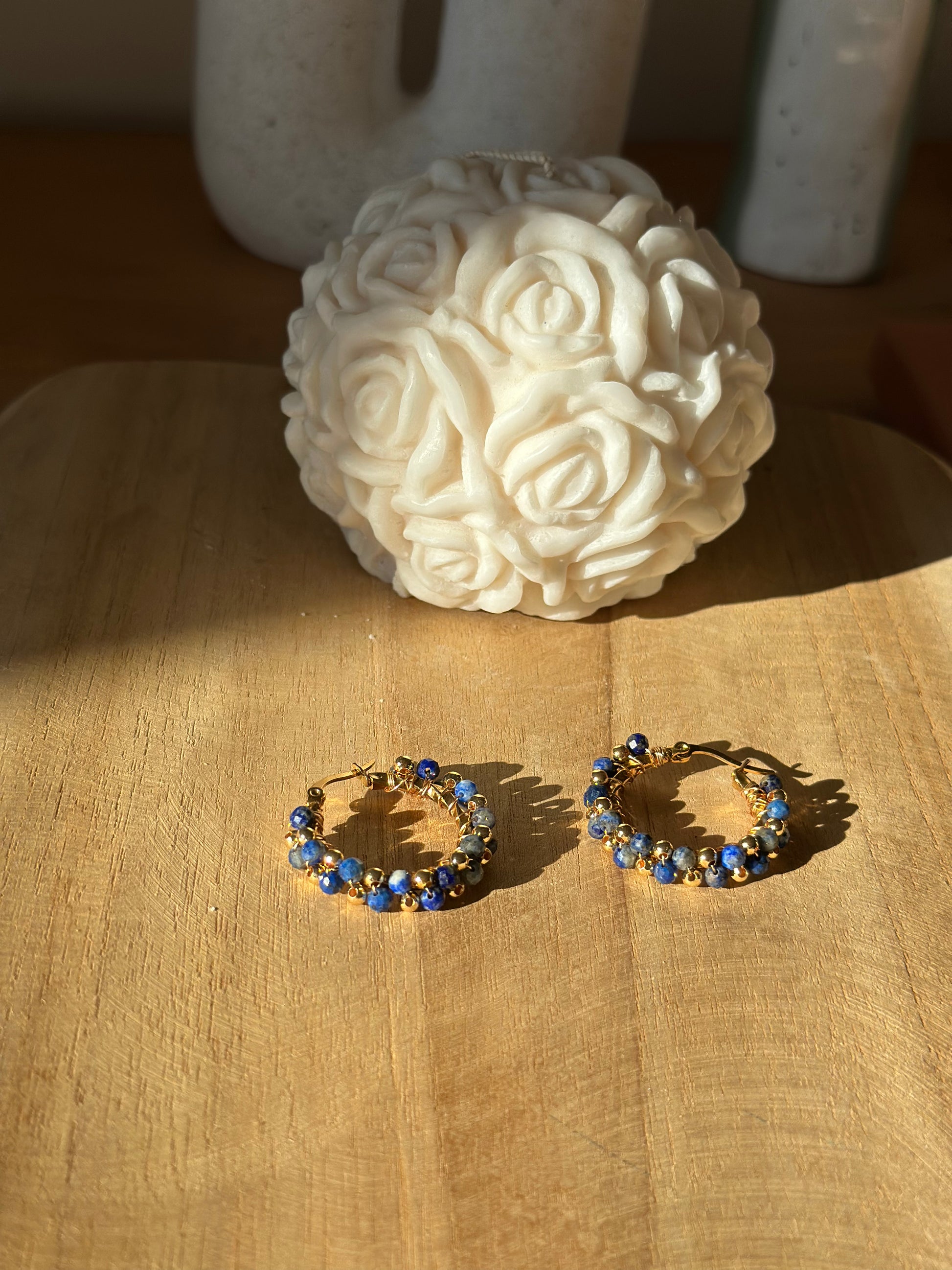 Créoles en acier inoxydable hypoallergenique torsadées, tissées à la main, perles en Lapiz Lazuli naturelles accompagnées de perles dorées à l'or fin 24K, fil en goldfilled (or laminé)